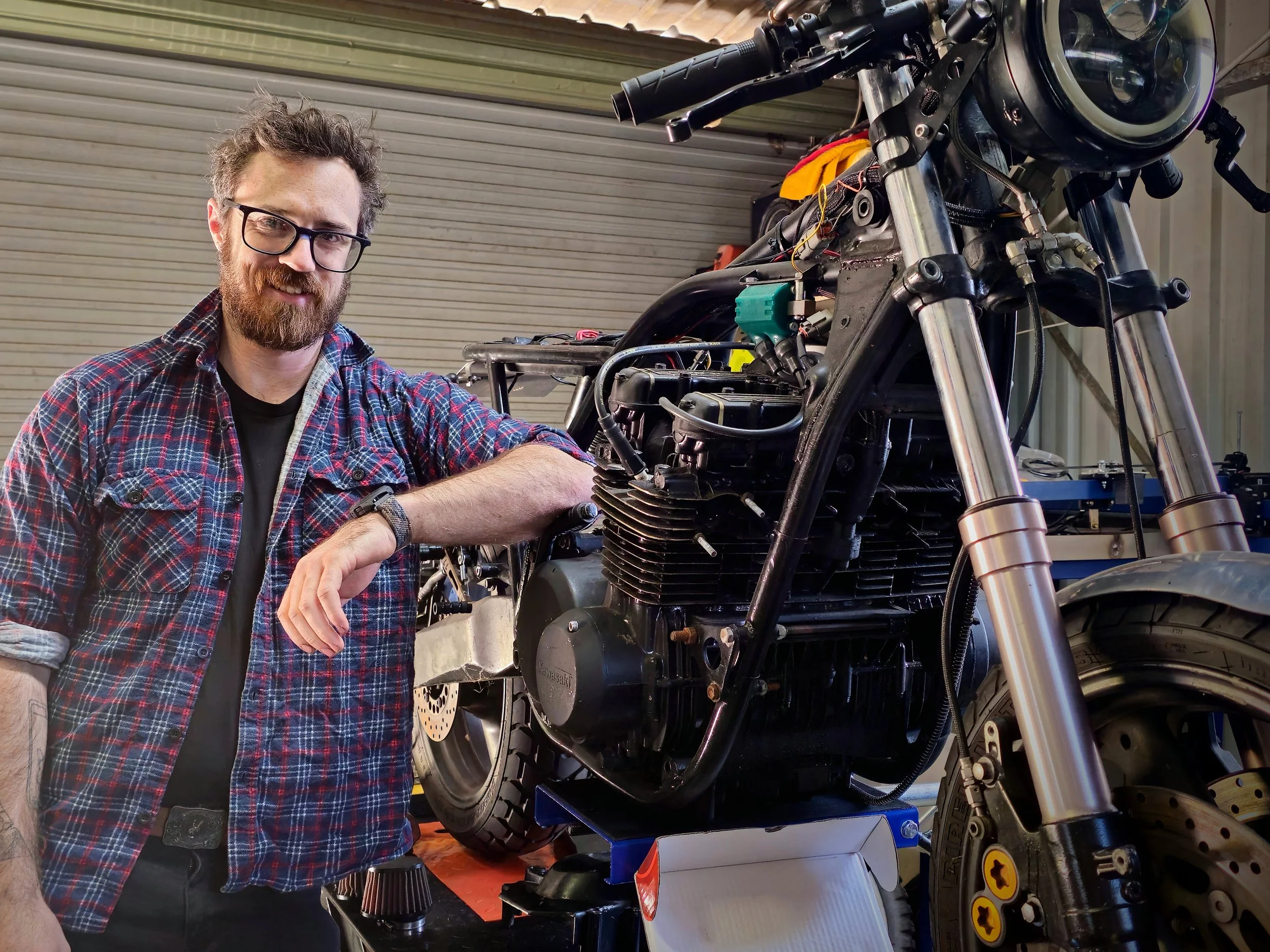 Man in plaid shirt standing beside a partially assembled motorcycle in a garage setting.