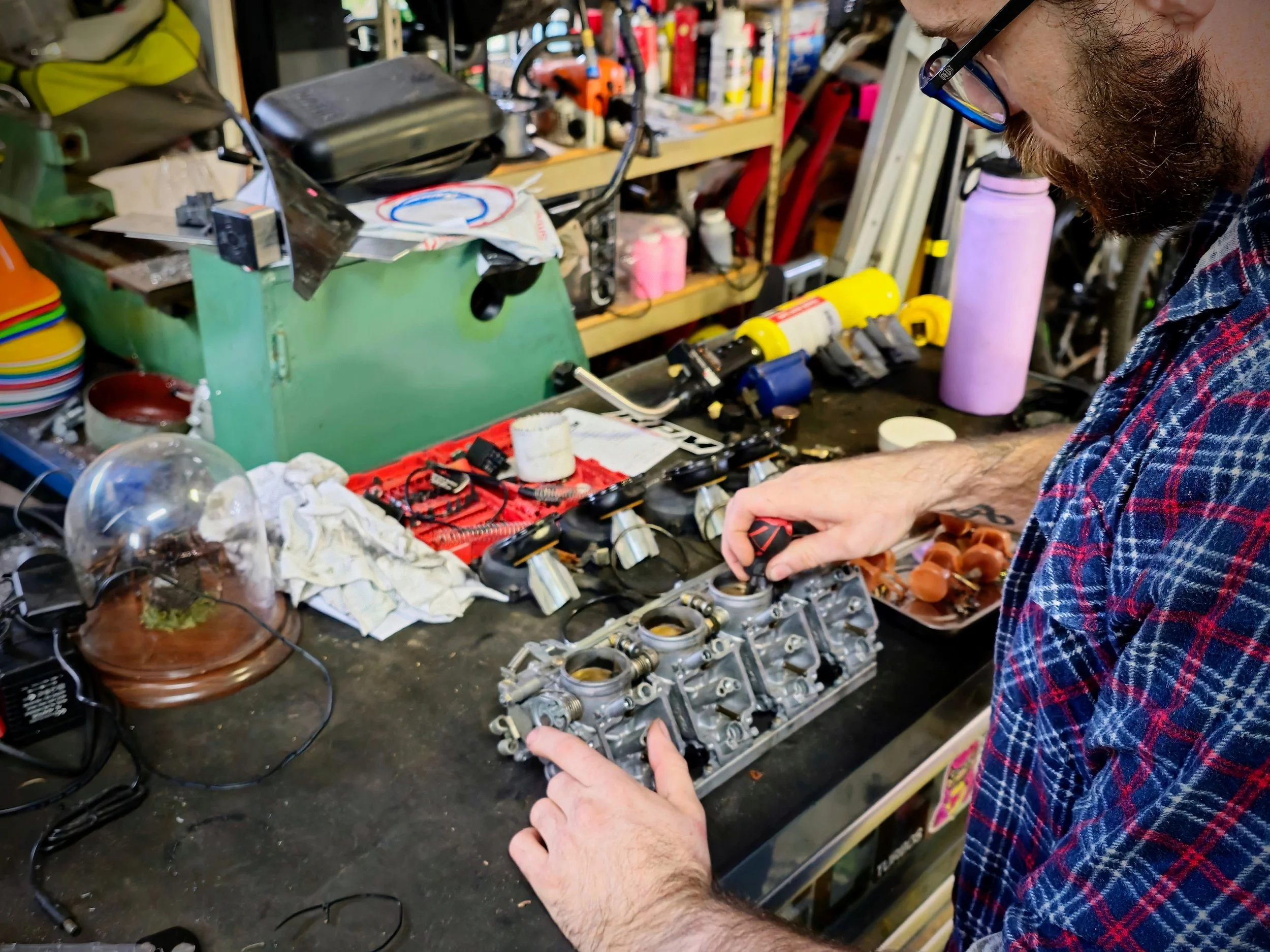 Person working on a carburetor in a cluttered workshop, surrounded by tools and parts on the table.